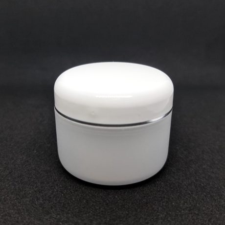 Kozmetička plastična kutijica sa duplim dnom, bijelim poklopcem sa srebrnim rubom i međupoklopcem.