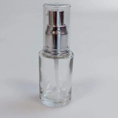 Staklena kozmetička bočica, prozirno staklo sa srebrnom kromiranom losion pumpicom.