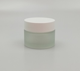 Staklena kozmetička kutija, matirano (frost – hemijska obrada) staklo u kompletu sa bijelim plastičnim poklopcem i međupoklopcem.