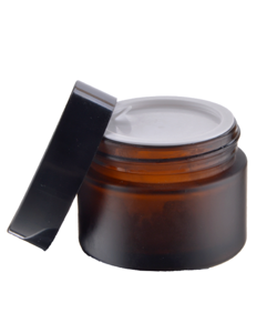 Smeđe matirano staklo, u kompletu sa crnim plastičnim poklopcem i bijelim međupoklopcem.