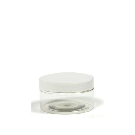 PET kutija, prozirna, 100 ml, sa plastičnim bijelim poklopcem.