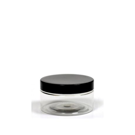 PET kutija, prozirna, 100 ml, sa plastičnim crnim poklopcem.
