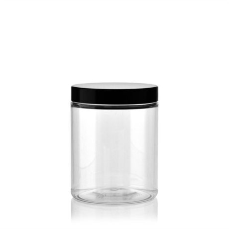 PET kutija, prozirna, 300 ml, sa plastičnim crnim poklopcem.