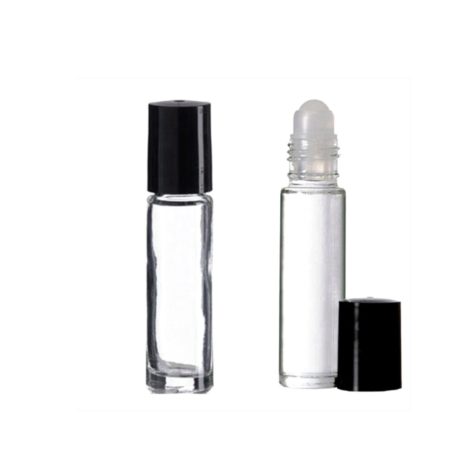Stakleni roll on, prozirna bočica sa plastičnom kuglicom i crnim čepom.
