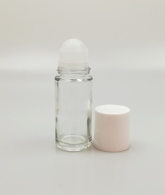Prozirna staklena bočica sa kuglicom, umetkom i bijelim poklopcem.